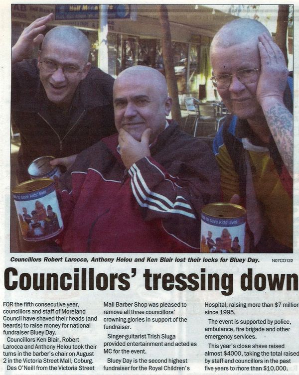 Anthony and his colleagues sat in a chair at Victoria Street Mall and had their heads and beards shaved off, on BLUEY DAY.