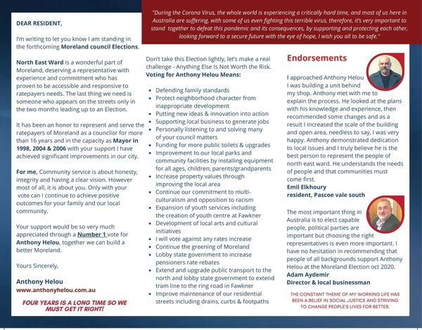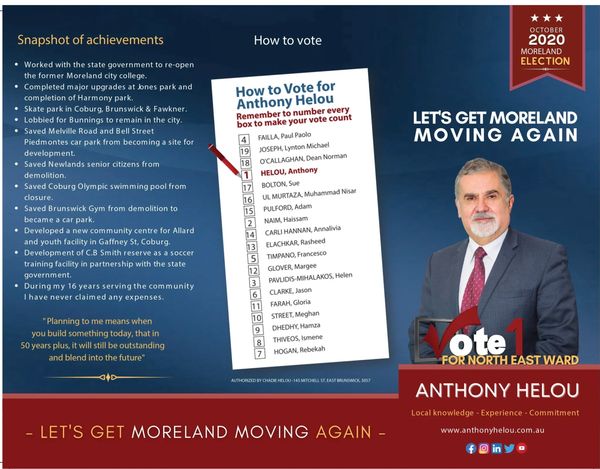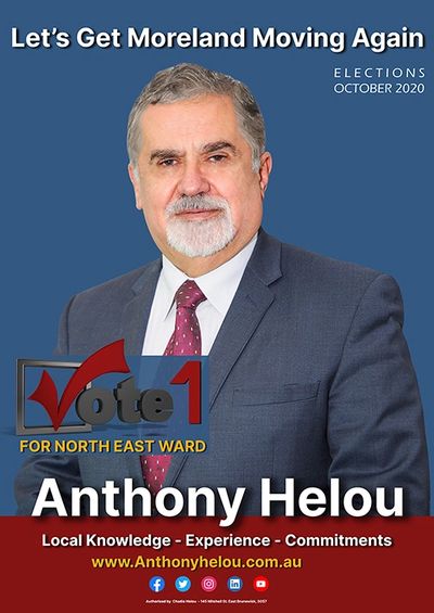 Anthony Helou is a true Councillor who will serve your interests in the community and in council chamber and Anthony always fought to keep business in Moreland. A vote for Anthony Helou is a vote for a strong, experienced and active member of council. If you want to be sure that your views and needs are acted upon by Moreland council, vote No. 1 for Anthony Helou.Follow us on https://www.facebook.com/@heloucandidate